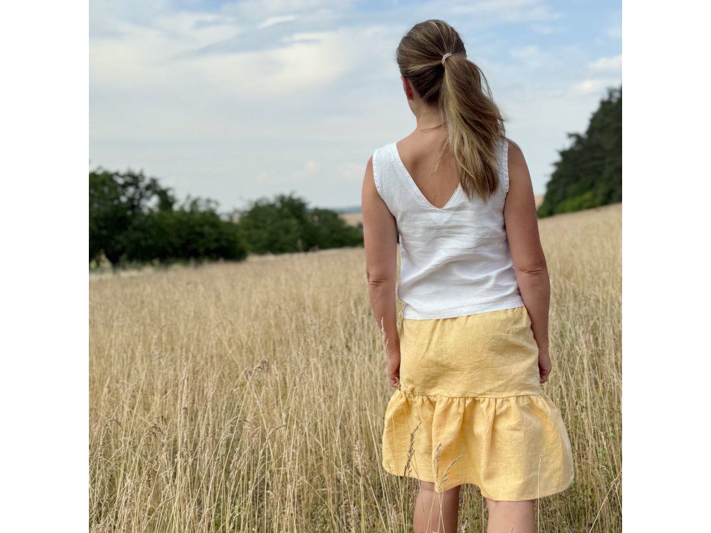 Top jednoduchého volného střihu je ušit ze 100% lnu tkaného v jesenických horách. Lněné plátno je lehké, prodyšné, velmi rychle schne a má spoustu zajímavých vlastností, o kterých se můžeš více dočíst na našem Lněném blogu.
