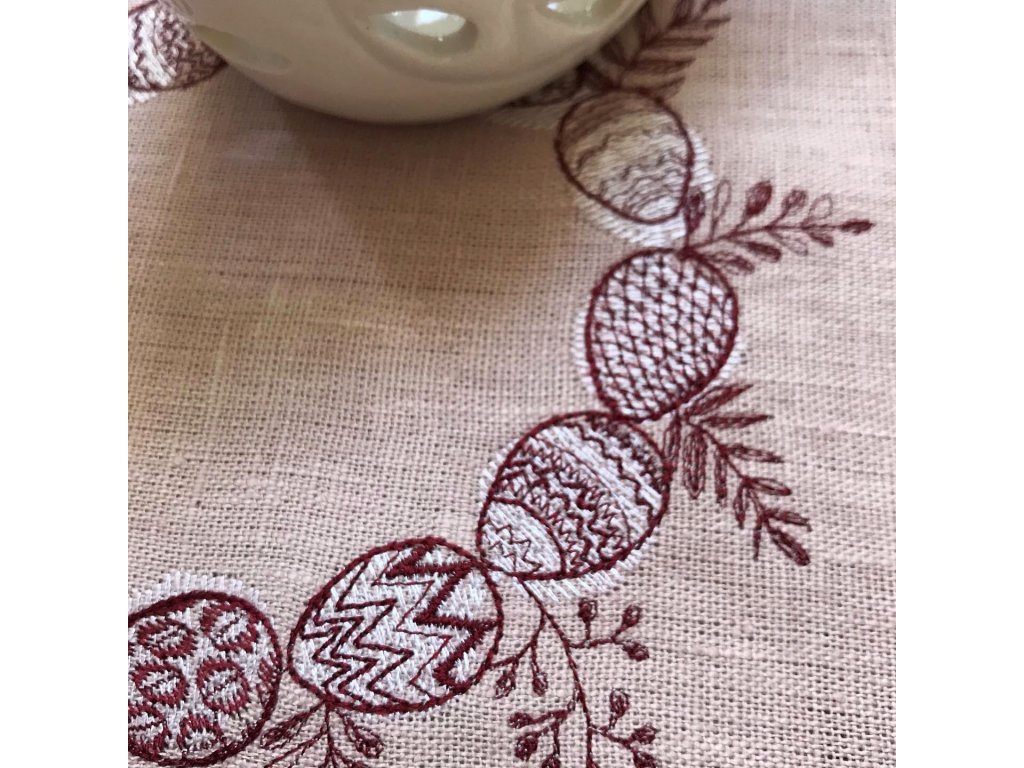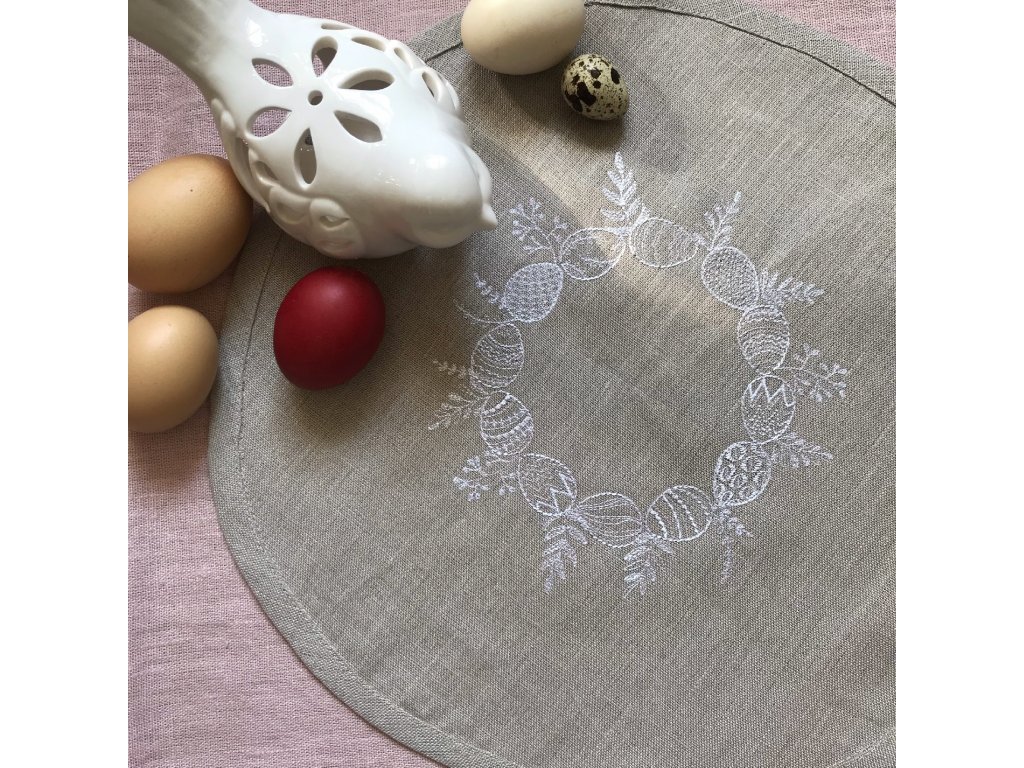 Na lněné prostírání v jemných pastelových tónech pudrové a mátové jsme jen pro Tebe vykouzlili elegantní výšivku velikonočního věnečku. Věnečku z dvanácti kraslic, který na Tvém stole bude symbolizovat nejen největší křesťanské svátky, ale oslavovat i příchod jara a koloběh života.  JESENIKY_uzivatel_barev3