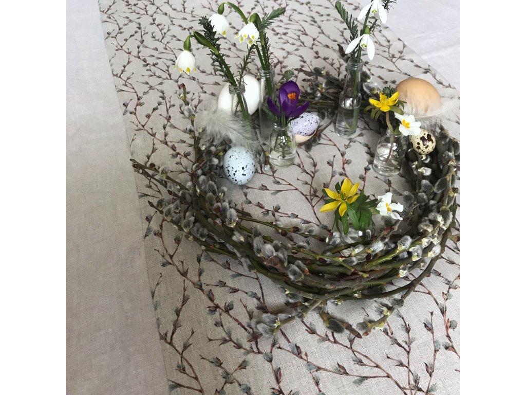 Jako děti jsme s babičkou trhaly rozkvetlé větvičky vrby jívy, abychom je o květné neděli vzali s sebou do naší vesnické kaple k vysvěcení a poté je zastrčily v kuchyni za obrázek na zdi, nebo jim našly důstojné místo v babiččině sekretáři. Větvičky jívy jsou pro nás nezaměnitelným symbolem jara, Velikonoc a dětství. Proto nesmí chybět na našem lnu.  JESENIKY_uzivatel_barev3