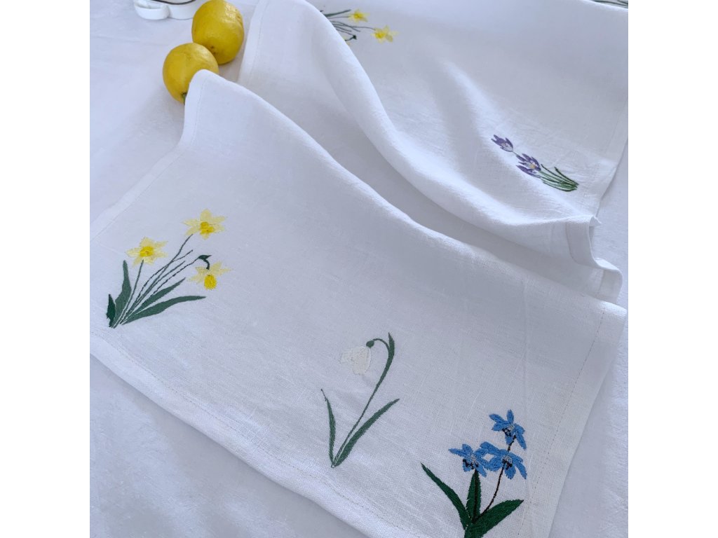 Vyšívaný běhoun posetý jarními květy je ušitý ze lnu tkaného v Jeseníkách. jsou na něm vyšity 3 trsy narcisů, dva trsy ladoněk, 2 sněženky a krokusy. Rozměr běhounu je 40x144 cm.