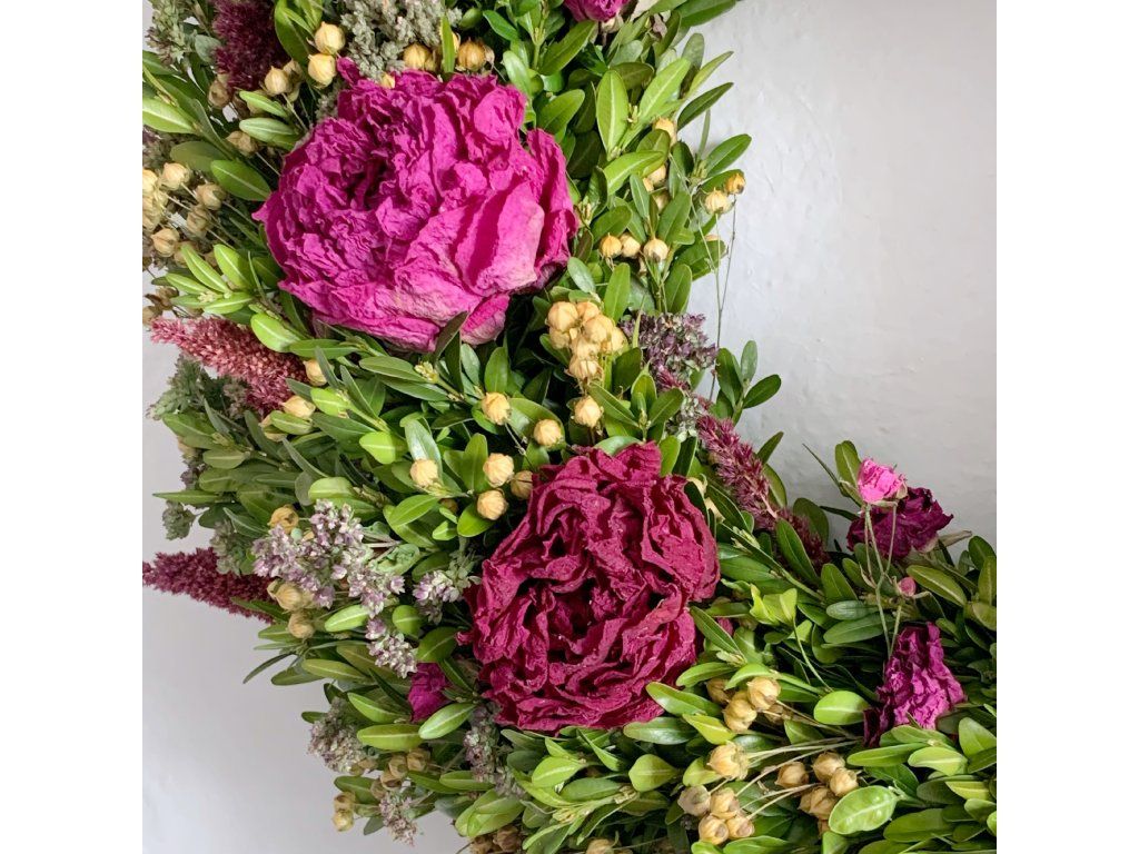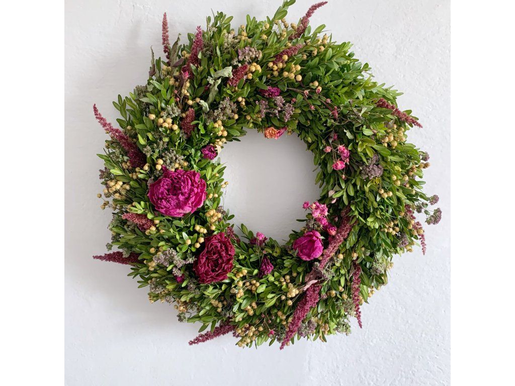 Bohatý přírodní věnec uvitý ze stálezeleného buxusu. Zlatavé tóny mu propůjčují tobolky milovaného lnu. Nachové odstíny v něm má léčivá a voňavá dobromysl společně s laskavcem. A ty tmavě růžové krásky, to jsou domácí pivoňky.