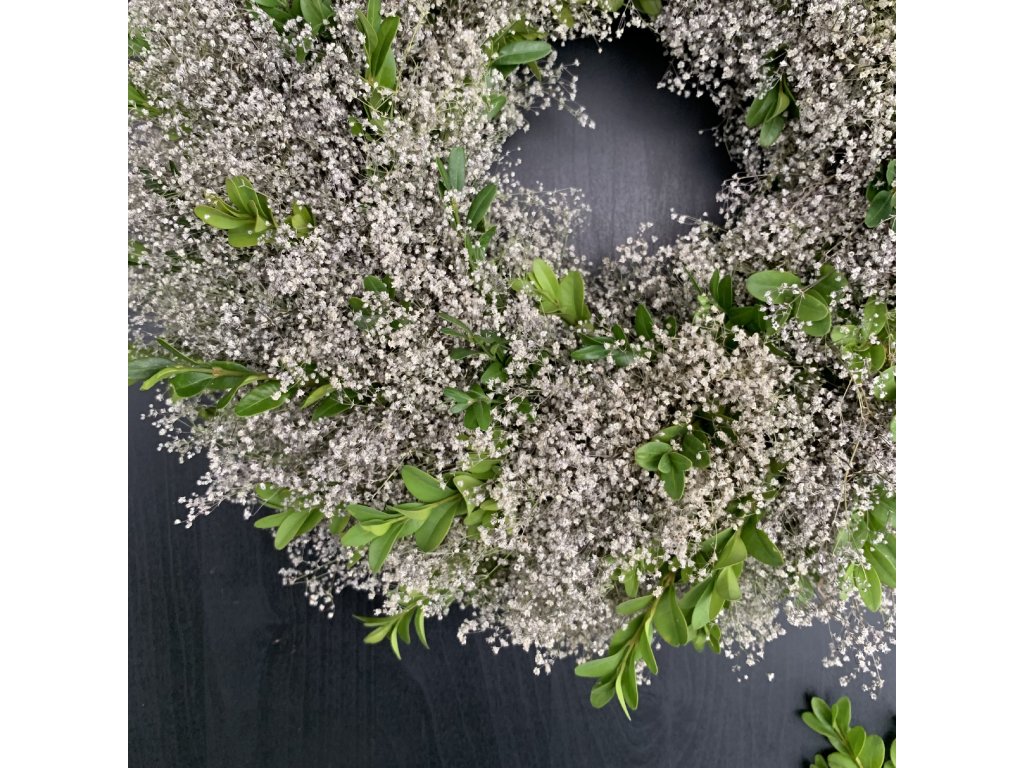 Bohatý věnec ze šateru a buxusu, ručně namotaný na slaměném základu. Svým osobitým kouzlem dotvoří nezaměnitelnou atmosféru Tvého domova. Je jen na Tobě, jestli ho necháš v tomto minimalistickém stavu, nebo ho ozdobíš doplňky podle svého vkusu. Vnější průměr věnce je cirka 40 cm.