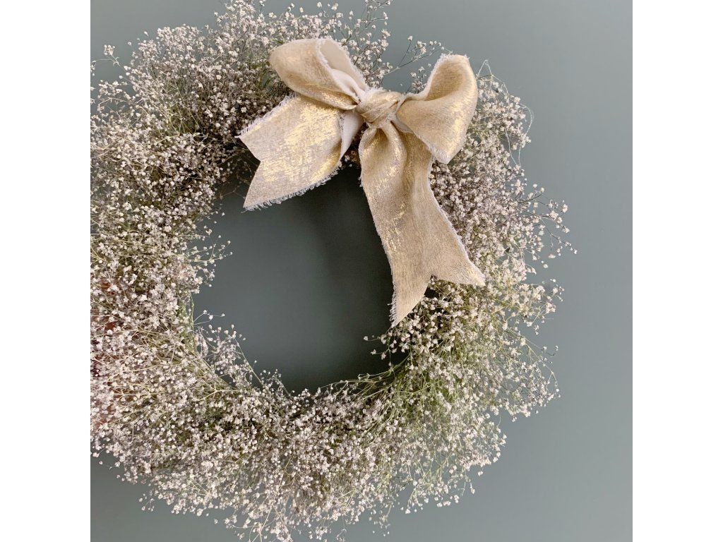 Varianta 2: jednodruhový věneček ze šateru, drátěný základ, zlatá mašle, vnější průměr cirka 26 cm