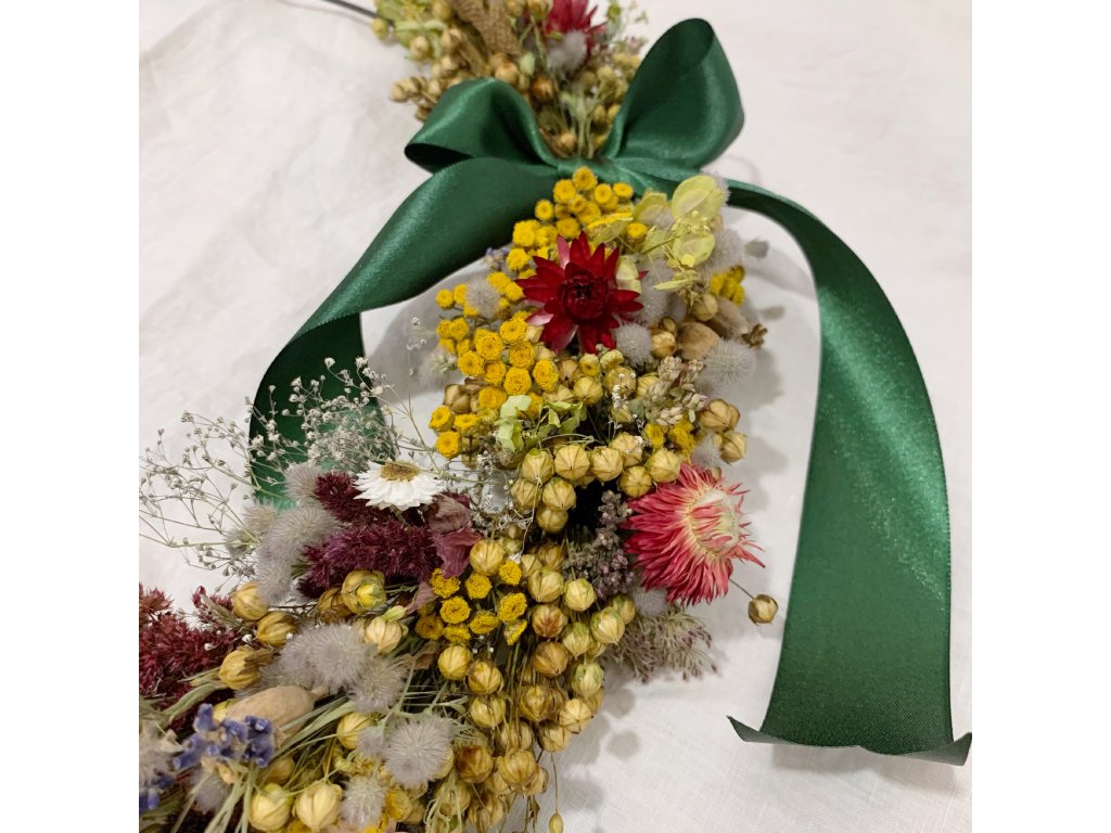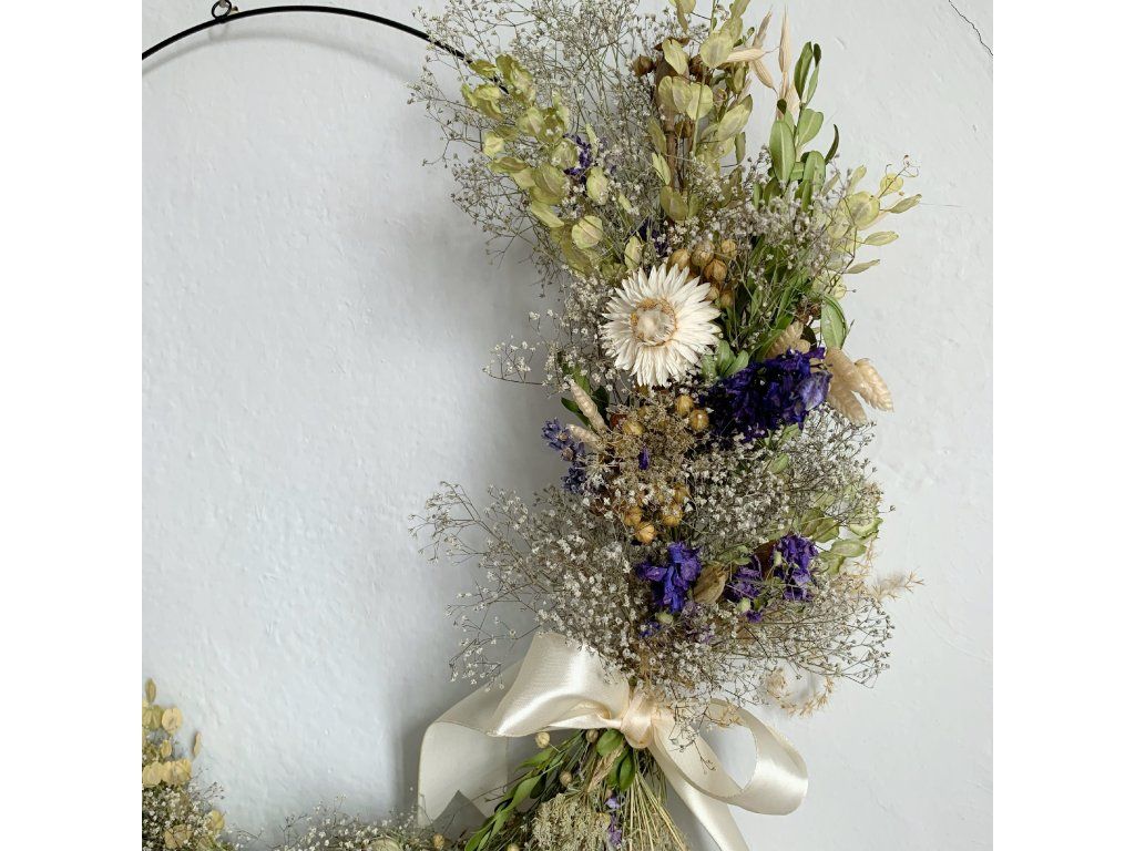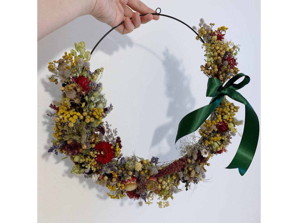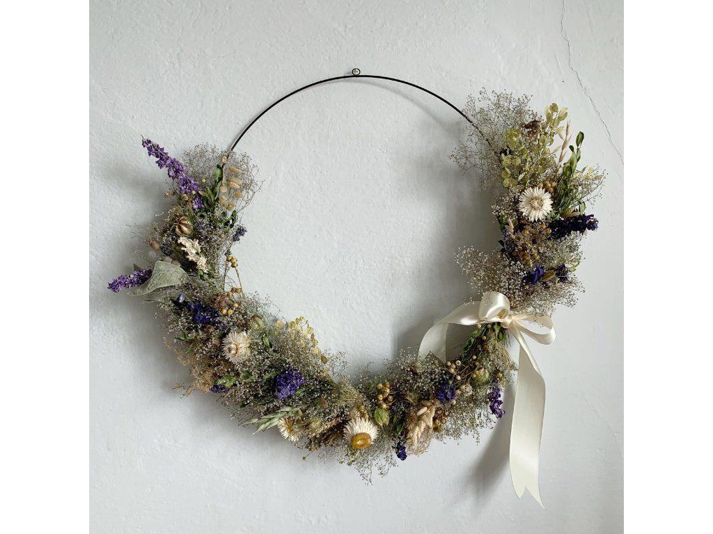 Věneček je ručně umotaný na drátěném základu a zdobený sušeným zahradním kvítím. Svým osobitým kouzlem dotvoří nezaměnitelnou jarní atmosféru Tvého domova.