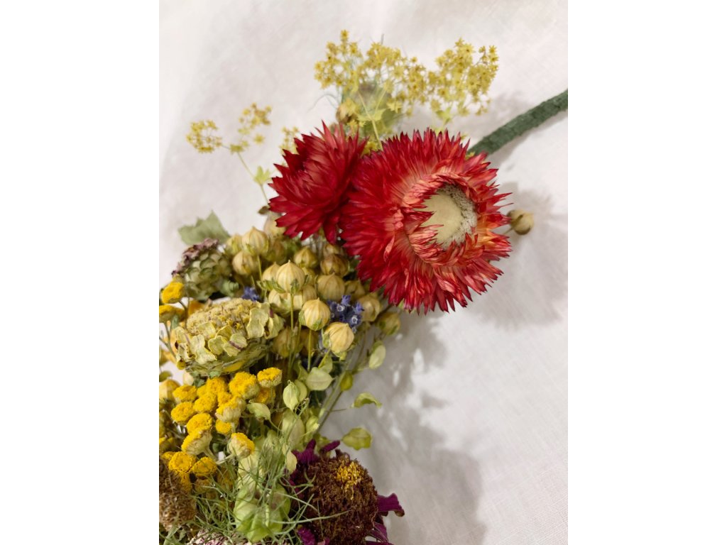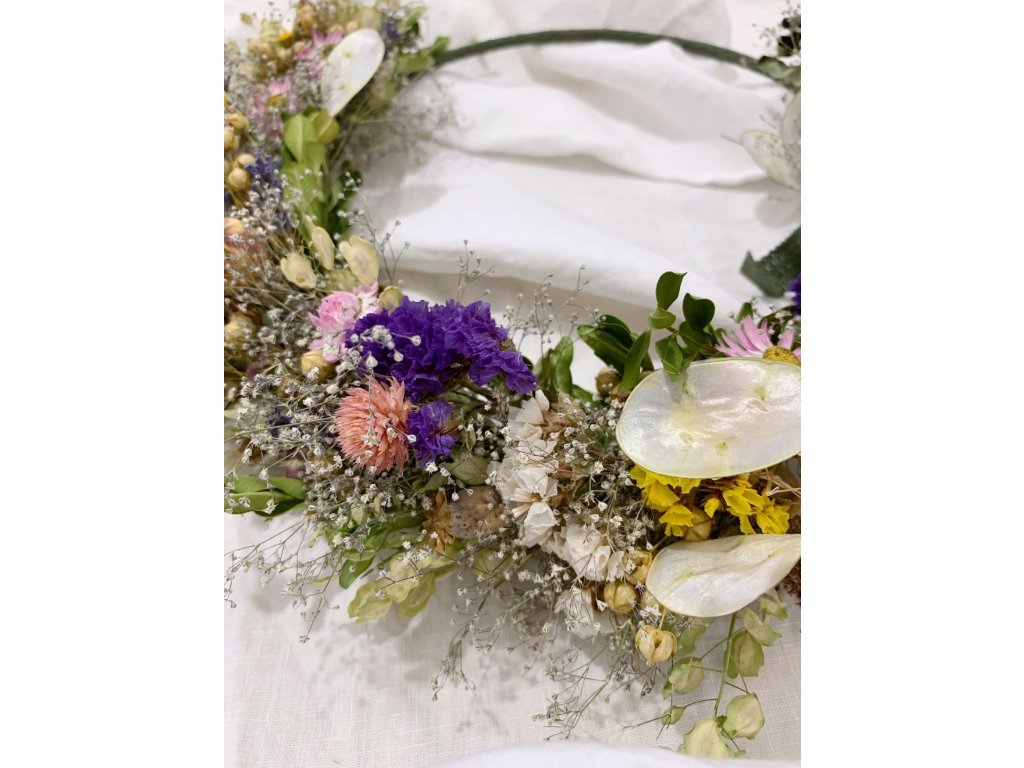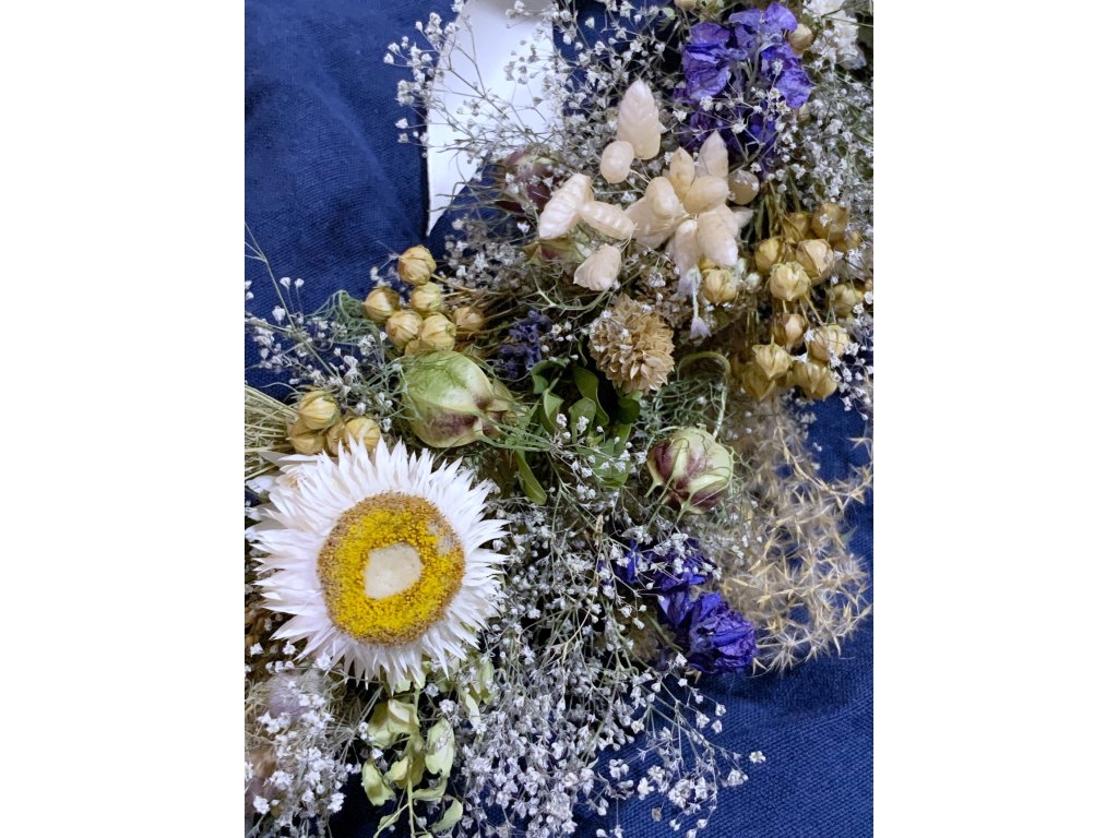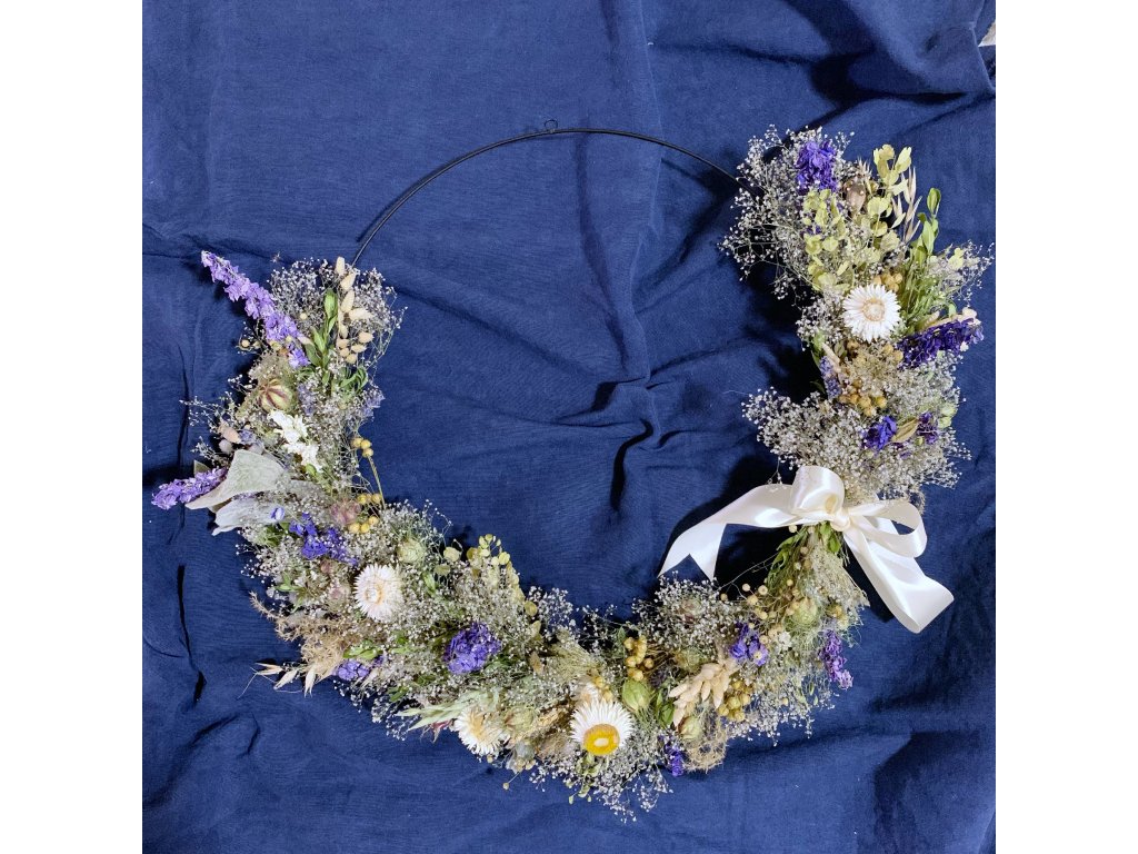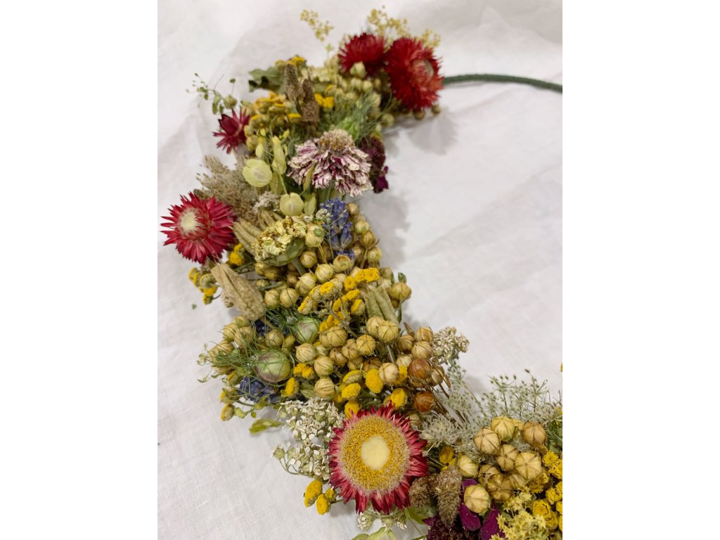 Věneček je ručně umotaný na drátěném základu a zdobený sušeným zahradním kvítím. Svým osobitým kouzlem dotvoří nezaměnitelnou jarní atmosféru Tvého domova.